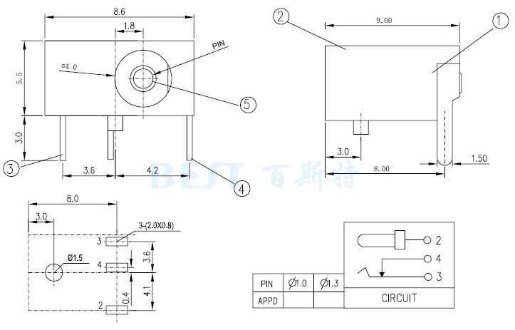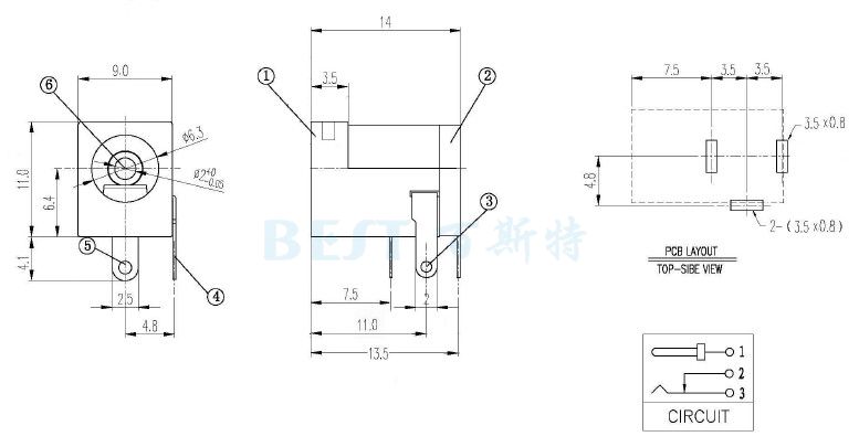 DC電源插座DC-005額定值是DC30V0.5A,插入力度是3到20N,是插件DC電源插座,針芯直徑2.0/2.5,DC插座的孔徑尺寸是6.4mm.3個插腳。壽命5000次,具體參考DC-005的圖紙說明。